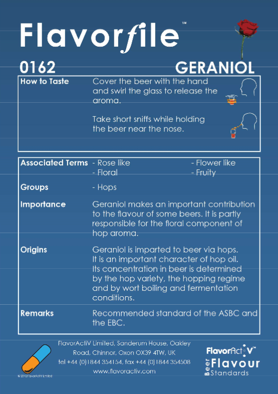– สาเหตุ: มากจากฮอพส์บางชนิดที่ให้กลิ่นกุหลาบ/ดอกไม้ แต่ถ้าส่วนผสมที่ใส่ไปไม่มีฮอพส์ชนิดดังกล่าว+กับรูปแบบเบียร์ที่คุณกำหนดก็คือ Off-Flavors หรืออาจเกิดจากการต้มและการหมัก